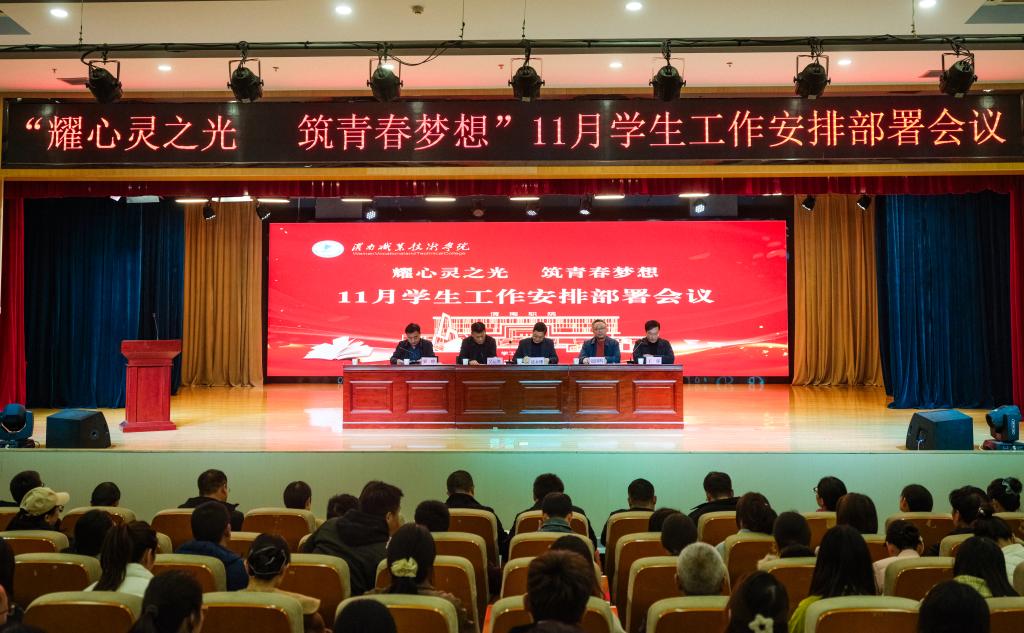耀心灵之光,筑青春梦想。2025年11月4日下午,我校在高新校区图书馆一楼报告厅召开11月学生工作安排部署会议。学院党委委员、总会计师吴运胜,党委委员、副院长赵永刚出席会议,学生处、保卫处负责人,各二级学院学生工作负责人、全体辅导员及班主任参加会议。会议由学生处副处长王强主持。
