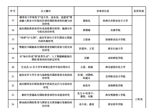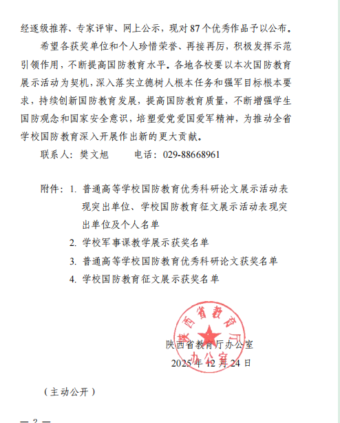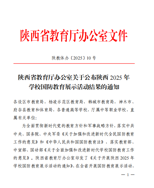 近日,陕西省教育厅办公室发布了《关于公布陕西2025年学校国防教育展示活动结果的通知》(陕教体办〔2025〕10号)。经逐级推荐、专家评审与公示,我校教师在本次活动中表现突出,彰显了扎实的学术研究和国防教育实践能力。