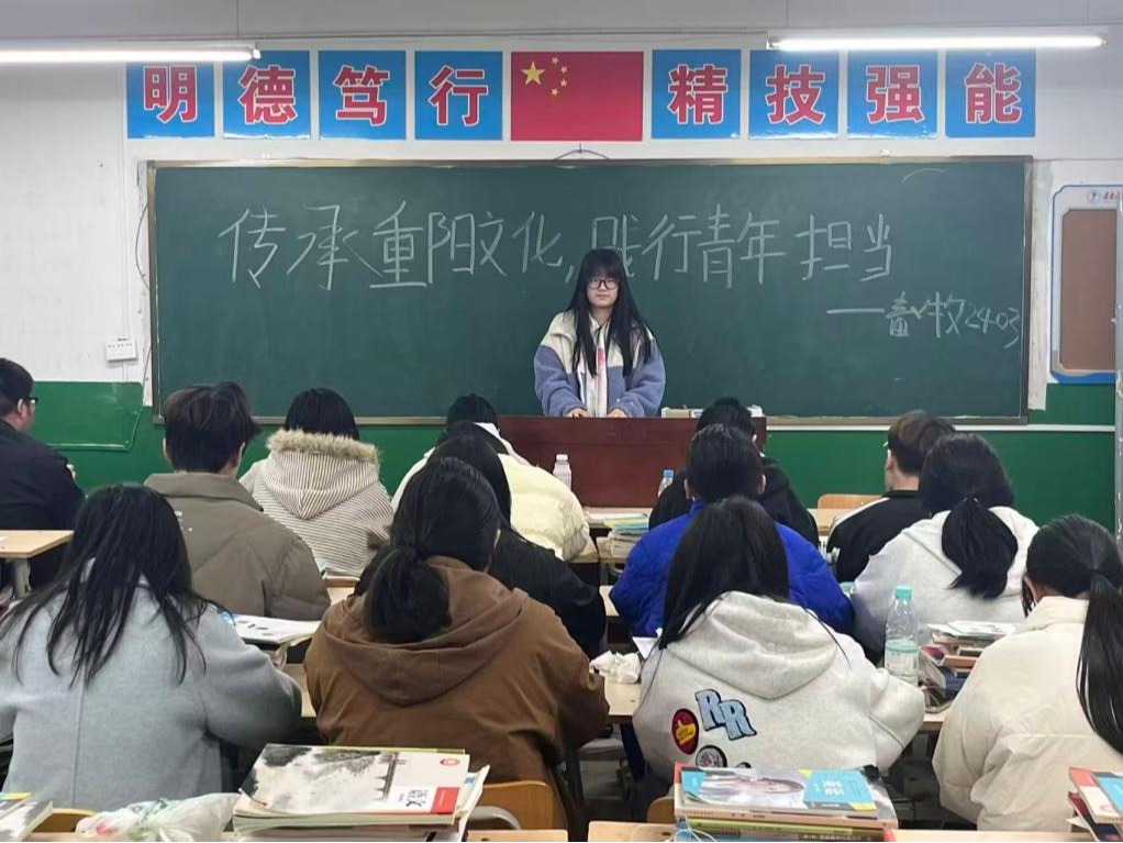 本次团课以重阳节的历史底蕴与时代价值为核心,引导青年学子在感知传统中深化文化认同,将孝道精神转化为服务社会的实际行动。团课上,各班团支书通过历史文献解读、民俗案例分析等形式,系统梳理重阳节的文化脉络。同时,强调尊老敬老从民俗传统向社会责任转变的时代要求。
