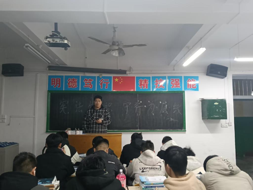 2025年12月2日晚自习,五高管理中心组织全校班级召开“学习宪法知识 守宪法底线”主题班会,通过知识讲解、歌曲传唱等形式深化宪法教育,强化学生法治观念。