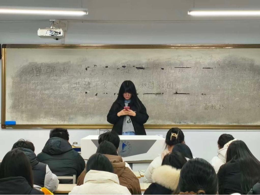 班会重点围绕法律底线、人身安全及应急能力展开。各班班长结合案例,讲解防范电信诈骗、远离非法物品及不良交往的重要性,强调“不出租出借银行卡”“警惕境外高薪陷阱”等法律风险;重申交通法规,严禁酒后驾车、校园欺凌及酗酒行为,倡导理性处理情感纠纷;同时培训宿舍用电安全、火灾逃生及应急疏散流程,严禁私自饲养宠物、违规销售商品及探险活动,确保校园环境稳定有序。